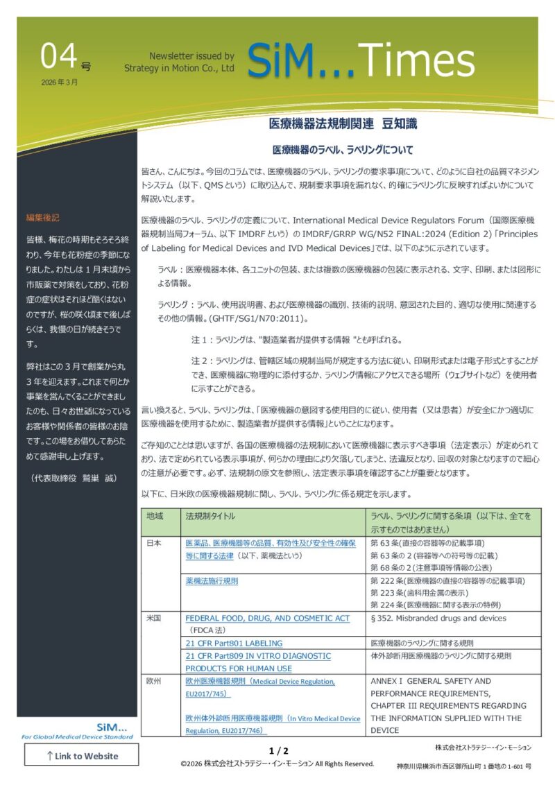 ニュースレター「SiM…Times」第4号発刊のお知らせ- 医療機器のラベル、ラベリングについて 2026年3月9日 最終更新日時 : 2026年3月9日 washinosumakoto 今回のコラムでは、医療機器のラベル、ラベリングの要求事項について、どのように自社の品質マネジメントシステム(以下、QMSという)に取り込んで、規制要求事項を漏れなく、的確にラベリングに反映すればよいかについて解説いたします。